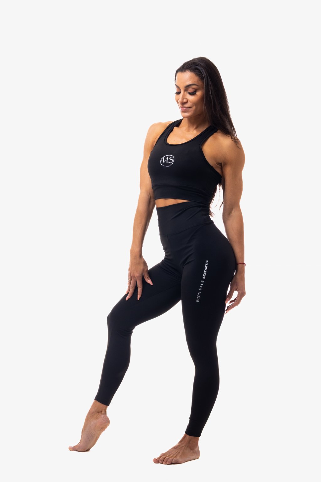 With a high-waisted cut that enhances the waist and glutes, these leggings combine functionality with a strong visual statement. The subtle MS logo on the back and the “Born To Be Aesthetic” text on the leg say it all — this is not just gym wear, it’s identity.