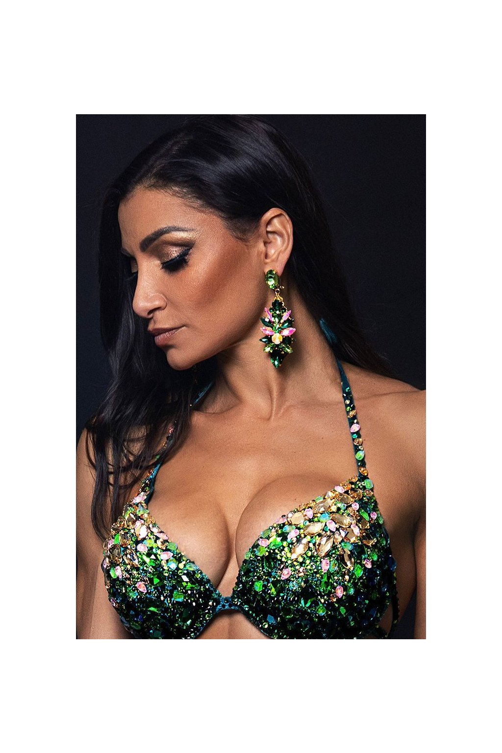 Luxusní závodní bikini set v zeleno-zlaté kombinaci, navržený pro maximální efekt na stage. Výrazný push-up vršek, precizní ruční práce a šperky laděné přímo k designu bikin.