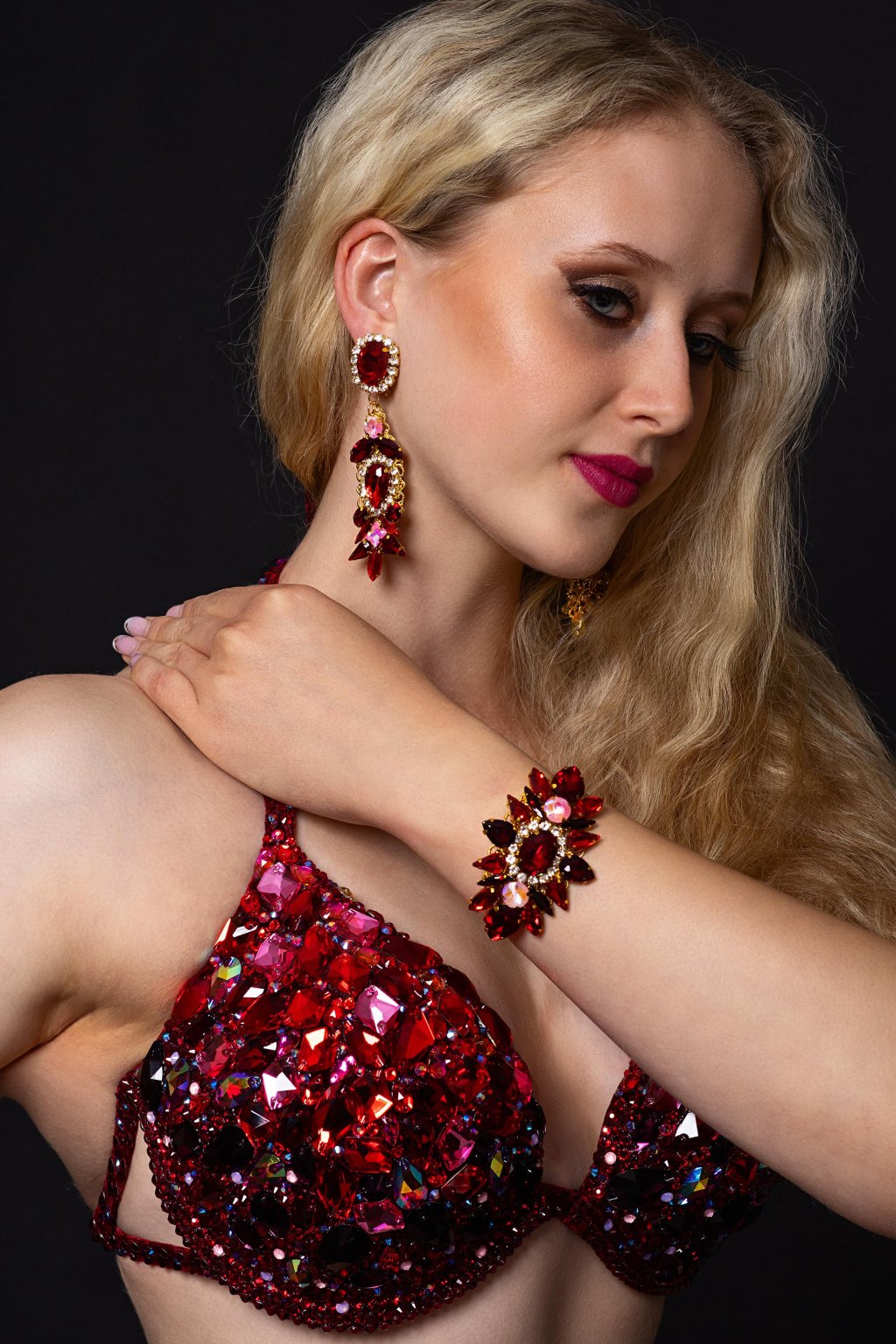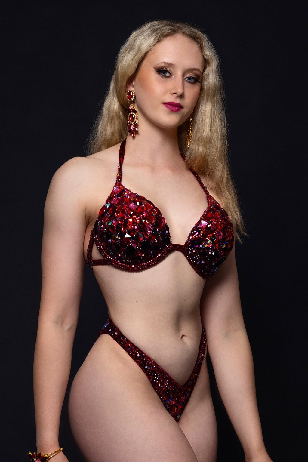 Volcán del Fuego je bikini set navržený pro závodnice, které chtějí na pódiu působit sebevědomě, dominantně a nepřehlédnutelně. Syté červené tóny v kombinaci s bohatým zdobením vytvářejí agresivní, energický look, který perfektně funguje pod soutěžním osvětlením.